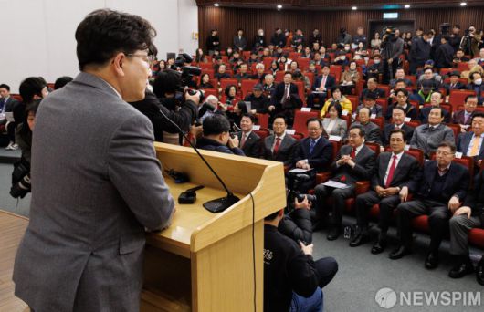[서울=뉴스핌] 윤창빈 기자 = 권성동 국민의힘 원내대표가 6일 오후 서울 여의도 국회 도서관에서 대한민국헌정회, 민주화추진협의회 주최로 열린 분권형 권력구조 개헌 대토론회에서 축사를 하고 있다. 2025.03.06 pangbin@newspim.com