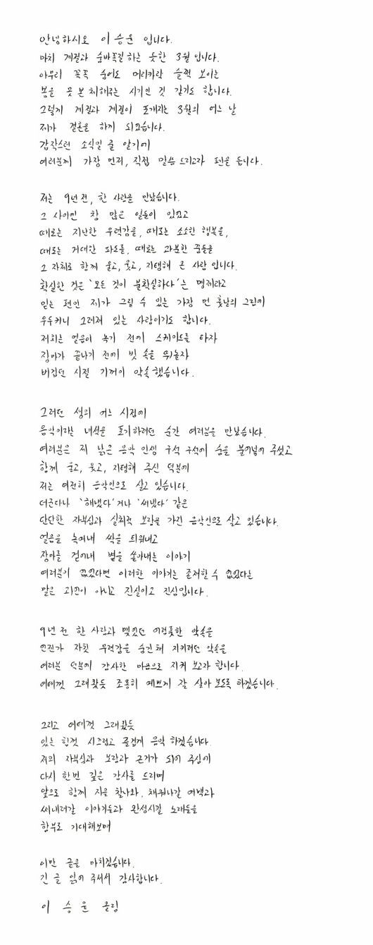 이어 이승윤은 "9년 전 한 사람과 맺었던 어렴풋한 약속을, 언젠가 자칫 무력함을 숨긴 채 지키려던 약속을 덕분에 감사한 마음으로 지켜보고자 합니다. 여태껏 그래왔듯 조용히 예쁘게 잘살아 보도록 하겠습니다"라고 전했다.