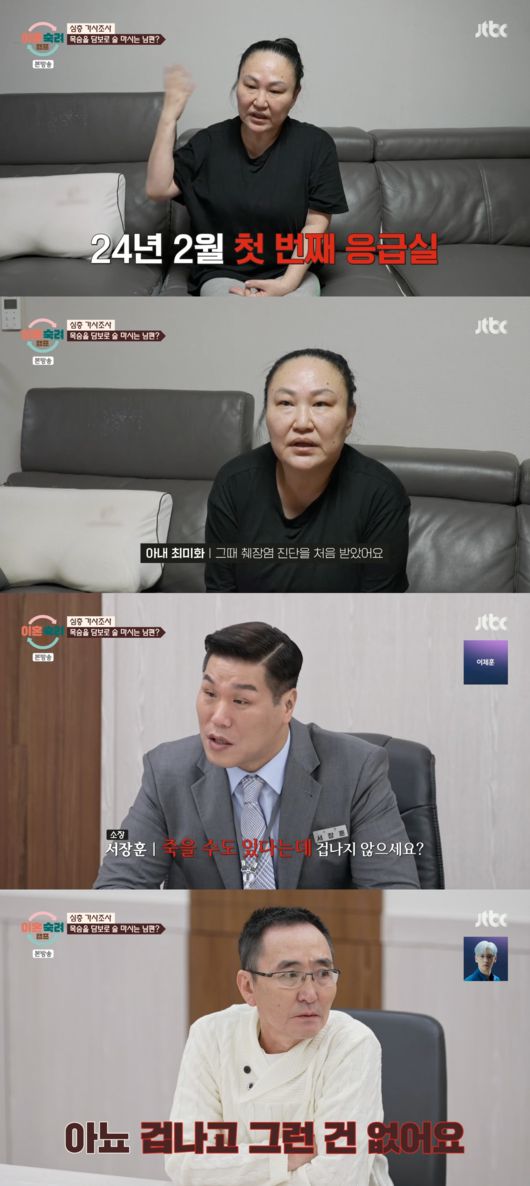 그럼에도 술을 끊지 못했다는 남편에 서장훈은 “죽을 수도 있다는데 겁나지 않으세요?”라고 물었고, 남편은 “겁나고 그런 건 없다”라며 술에 대한 문제를 심각하게 받아들이지 않는 모습을 보였다. 서장훈은 “이혼이 문제가 아니라 초상 치를 판이다”라며 어이 없어 했다.