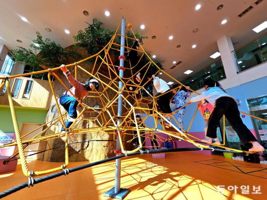 지난달 27일 경기 시흥시 하중동 ‘숨 쉬는 놀이터’를 찾은 어린이들이 거미줄 모양의 ‘스페이스 네트’에 오르고 있다. 숨 쉬는 놀이터는 황사나 미세먼지, 추위 등 기후 변화에도 안전하게 뛰어놀 수 있는 실내 놀이터로 시흥 시내에 3곳이 운영 중이다. 시흥=최승훈 채널A 스마트리포터 press653@donga.com ⓒ 동아일보 & donga.com, 무단 전재 및 재배포 금지