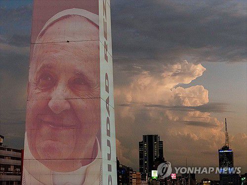 2월21일(현지시간) 아르헨티나 수도 부에노스아이레스의 상징탑에 투사된 프란치스코 교황의 모습. |