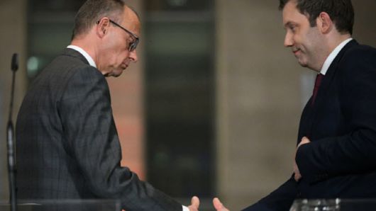 프리드리히 메르츠 독일 기독교민주연합(CDU) 대표와 리르스 클링바일 사회민주당(SPD) 대표가 4일 베를린에서 대규모 투자계획을 발표하는 기자회견 후 악수를 나누고 있다. (사진=AFP) |
