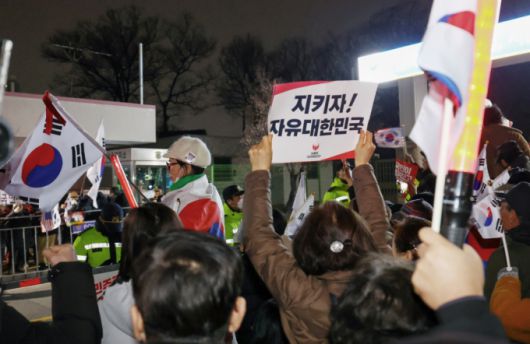 법원이 윤석열 대통령의 구속취소 청구를 인용한 7일 경기 의왕시 서울구치소 앞에서 윤 대통령 지지자들이 구호를 외치고 있다. /사진=뉴시스 |