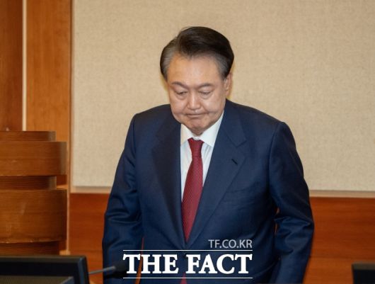 윤석열 대통령이 20일 오후 서울 종로구 헌법재판소에서 열린 탄핵심판 10차 변론에 굳은 표정으로 출석하고 있다. 2025.02.20 사진공동취재단 |