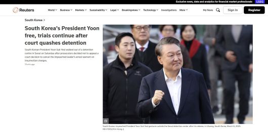 로이터와 AP 역시 메인 화면에 기사를 걸어 윤 대통령의 석방 사실을 알렸다. 로이터는 “법원 결정에 검찰이 항고하지 않겠다는 결정을 내린 후, 윤 대통령이 서울 구치소를 걸어 나왔다”라고 전했다. 그러면서 윤 대통령이 성명서를 통해 “불법을 바로잡아준 서울중앙지방법원의 용기와 결단에 감사드린다”라고 밝힌 사실을 전했다. AP는 “법원이 윤 대통령의 구속을 취소해 물리적으로 구금되지 않고 내란 혐의로 재판을 받을 수 있도록 한 지 하루 만인 8일 윤 대통령이 석방됐다. TV 영상에 자신의 이름을 외치며 대한민국과 미국 국기를 흔들던 지지자들에게 윤 대통령이 손을 흔들고 큰절을 하는 모습이 담겼다”라고 전했다.