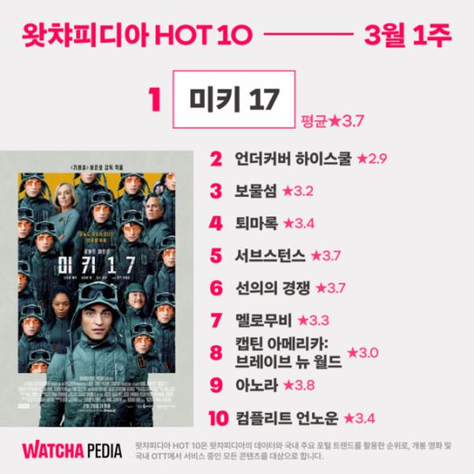 3월의 첫 1위는 봉준호 감독의 SF 영화 '미키 17'이 차지했다. '미키 17'은 위험한 일에 투입되는 소모품(익스펜더블)으로, 죽으면 다시 프린트되는 '미키'가 17번째 죽음의 위기를 겪던 중, 그가 죽은 줄 알고 '미키 18'이 프린트되면서 벌어지는 예측불허의 이야기를 그린다.
