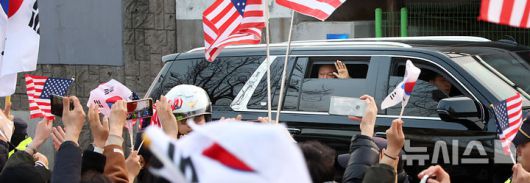 [서울=뉴시스] 김금보 기자 = 석방된 윤석열 대통령이 8일 오후 서울 용산구 한남동 관저 입구에 도착하며 지지자들에게 손을 흔들고 있다. 2025.03.08. kgb@newsis.com