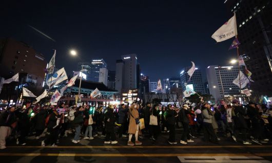 8일 서울 종로구 종로1가 교차로 일대에서 윤석열 대통령 파면 촉구 범국민대회를 마친 시민과 참가자들이 행진을 하고 있다. 연합뉴스 |