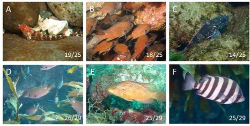 저수온기에 독도 주변 바다에서 가장 빈번하게 관찰된 어류(A∼C)와 고수온기 제일 빈번하게 관찰된 어류(D∼F). A는 가막베도라치(온대성), B와 D는 자리돔(아열대성), C는 개볼락(온대성), E는 어렝놀래기(열대성), F는 돌돔(온대성). [울릉도와 독도 생물다양성 특성 연구 보고서 갈무리. 재판매 및 DB 금지] |