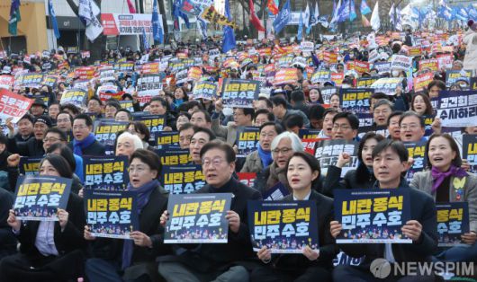 [서울=뉴스핌] 양윤모 기자 = 법원이 윤석열 대통령 구속 취소 청구를 인용한 뒤 주말인 8일 오후 서울 안국동 사거리에서 열린 '야5당 공동 내란종식·민주헌정수호를 위한 윤석열 파면 촉구 범국민대회'에서 더불어민주당 이재명 대표, 조국혁신당 김선민 당 대표 권한대행 등 참가자들이 손팻말을 들고 구호를 외치고 있다. 2025.03.08 yym58@newspim.com |