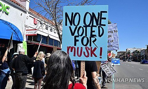 미국 캘리포니아 테슬라 매장 앞에서 '머스크 반대' 시위 벌이는 시민들 |