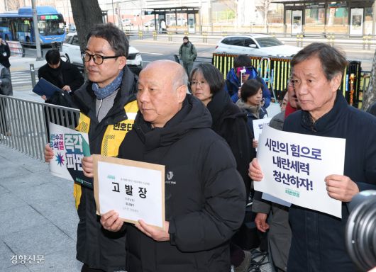 “고발합니다” 윤석열즉각퇴진·사회대개혁 비상행동 공동대표들이 9일 서울 서대문구 국가수사본부에 심우정 검찰총장을 직권남용 혐의로 고발하고 있다. 정효진 기자 |