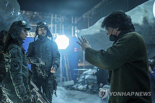 영화 '미키 17' 촬영장에서 봉준호 감독이 배우들과 소통하는 모습 |
