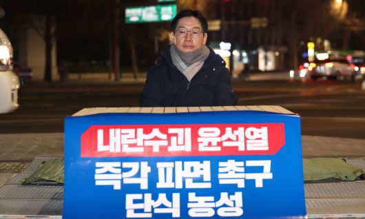 김경수 전 경남지사가 9일 저녁 서울 종로구 경복궁역 인근에서 윤석열 대통령 파면을 촉구하는 단식 농성을 하고 있다. 뉴시스 |