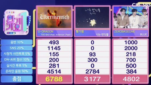 지난 9일 방송된 SBS '인기가요'에서는 지드래곤의 '투 배드(Too Bad)', 황가람의 '나는 반딧불', 제로베이스원의 '블루(BLUE)'가 1위 후보에 올랐다.
