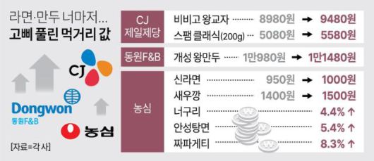 라면 업계 1위인 농심도 가격 인상 대열에 합류했다. 대표 라면인 신라면은 이달 17일부터 소매점 기준 950원에서 1000원으로, 새우깡은 1400원에서 1500원으로 각각 50원·100원 오른다. 신라면 외 주요 제품 가격도 오른다. 제품별로는 출고 가격 기준 너구리 4.4%, 안성탕면 5.4%, 짜파게티 8.3%, 새우깡 6.7%, 쫄병스낵 8.5% 등이다.
