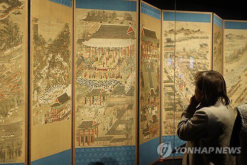 국외소재문화유산재단과 삼성문화재단은 10일 서울 용산구 리움미술관에서 최근 보존 처리를 마친 '평안감사도과급제자환영도'(平安監司道科及第者歡迎圖) 8폭 병풍을 공개했다.