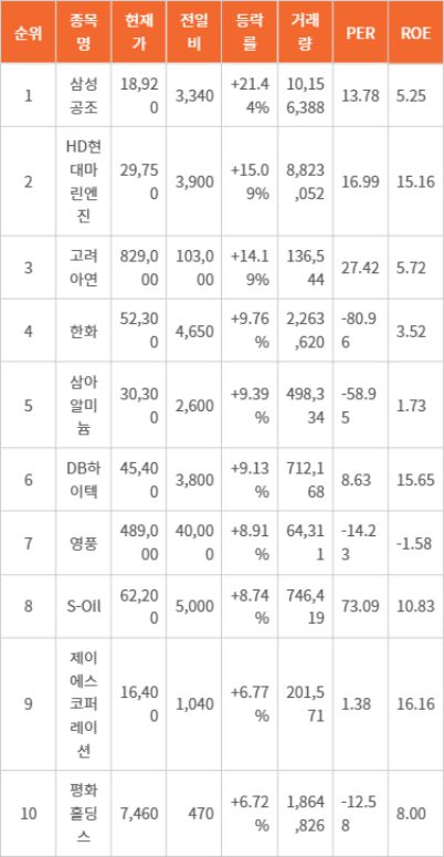 DB하이텍(000990)은 +9.13%의 등락률과 45,400원의 현재가를 기록했으며, 영풍(000670)은 +8.91%의 등락률과 489,000원의 현재가로 거래를 마쳤다. S-Oil(010950)은 +8.74%의 등락률과 62,200원의 현재가로 장을 마감했다. 제이에스코퍼레이션(194370)은 +6.77%의 등락률을 보이며 16,400원에 거래를 종료했고, 평화홀딩스(010770)는 +6.72%의 등락률과 7,460원의 현재가로 장을 마쳤다.