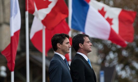 쥐스탱 트뤼도 캐나다 총리(왼쪽)가 2016년 10월 캐나다를 방문한 당시 마뉘엘 발스 프랑스를 총리를 환영하는 의식이 진행 중인 가운데 두 나라 국기가 펄럭이고 있다. 캐나다 총리실 홈페이지 |