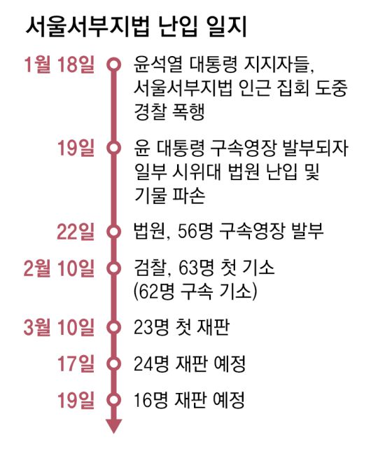윤석열 대통령에 대한 구속영장이 발부된 1월 19일 새벽 서울서부지법에 지지자들이 난입해 소화기를 뿌리며 난동을 부리는 모습. 집단 난동에 가담해 기소된 78명 중 23명은 10일 첫 재판을 받았다. 나머지 가담자들은 17일, 19일 등 순차적으로 재판을 받을 예정이다. 뉴스1 |