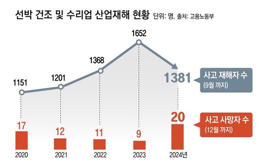 도널드 트럼프 2기 행정부 출범 이후 한미 간 조선 협력 방안이 거론되며 호황기를 맞이한 조선해운업의 산재 피해자 수가 4년간 크게 늘어난 것으로 나타났다. 고용노동부에 따르면 선박 건조 및 수리업 산재 피해자 수는 2020년 1151명에서 2023년 1652명으로 4년간 43.5%(501명)가 늘었다. 고용부에 따르면 지난해 조선업 산재 사망자 수는 20명으로, 최근 5년간 최고치를 기록했다.