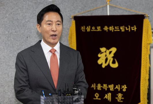 오세훈 서울시장이 11일 오전 서울 여의도 국회 의원회관에서 열린 국회무궁화포럼 제6회 토론회에서 ‘한국의 안보전략’을 주제로 기조연설을 마친 후 취재진 질문에 답변하고 있다. 2025.3.11/뉴스1 |