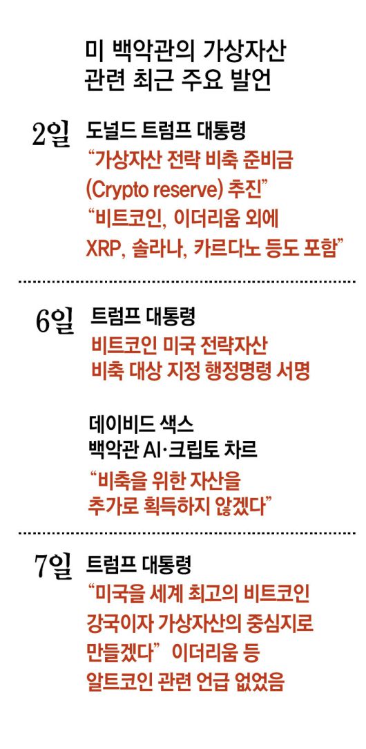트럼프 대통령의 친(親)가상자산 정책이 시장 기대치에 미치지 못한 것도 내림세를 부추기고 있다. 6일(현지 시간) 트럼프 대통령이 비트코인을 비축한다는 행정명령에 서명했지만, 현재 압류된 비트코인 외에 추가 매집은 없다는 소식에 가상자산 가격은 하락했다. 미 백악관 주도의 ‘가상자산 서밋’에서도 구체적인 가상자산 지원책이 나오지 않으면서 투자자들의 실망감은 더 짙어졌다.