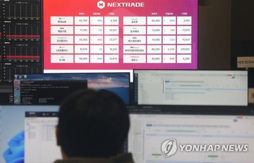(서울=연합뉴스) 조성흠 이민영 기자 = 국내 최초 대체거래소(ATS) 넥스트레이드(NXT)가 출범한 첫 한주 동안 개인 투자자 거래대금이 전체의 98%에 육박할 정도로 '개미'들의 반응이 뜨거운 것으로 나타났다.
