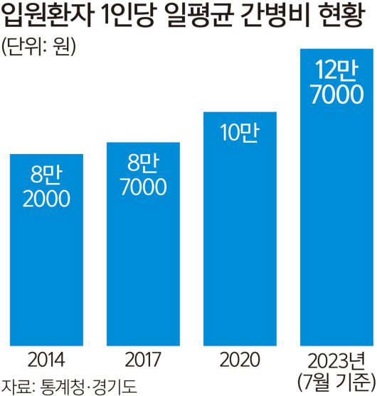 통계청에 따르면 입원이 필요한 환자들의 하루 평균 간병비 부담은 2014년 평균 8만2000원에서 2023년 7월 평균 12만7000원으로 급증했다. 뇌졸중 등 중증환자의 경우 하루 최대 30만원까지 비용이 치솟는 것으로 알려졌다. 하지만 지난해 4월 시행된 정부의 간병비 시범지원사업은 집중치료가 필요한 중증환자를 대상으로 연간 180일 한도로 60만∼70만원을 지원하는 수준으로 전해졌다.