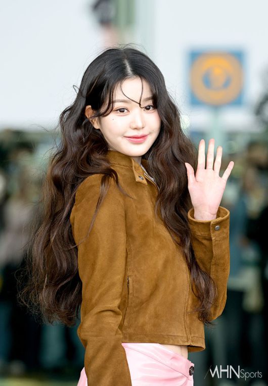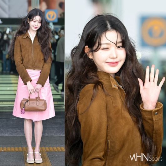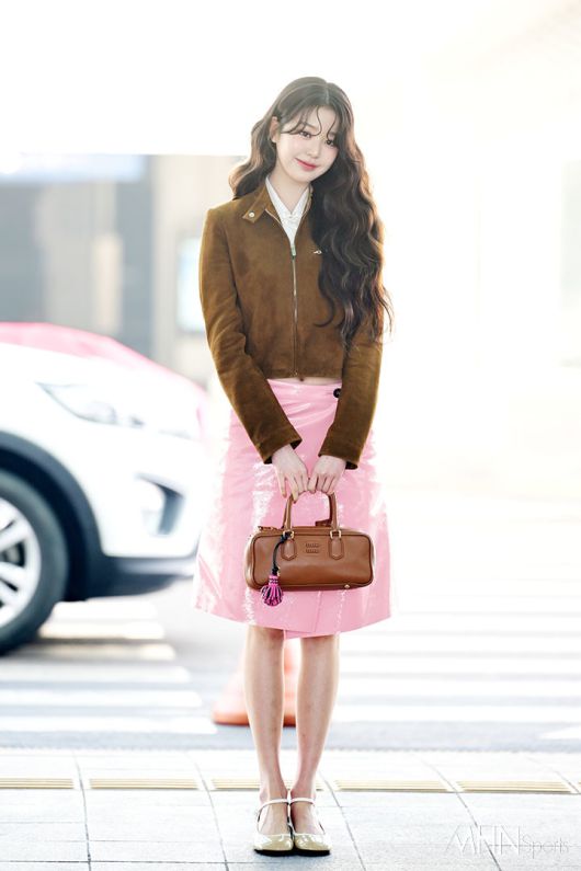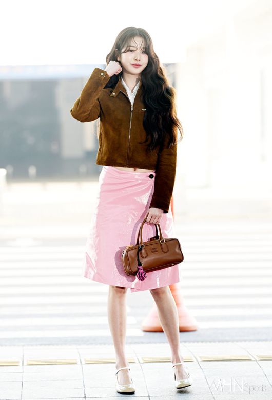 이날 장원영은 빈티지 감성이 물씬 풍기는 브라운 스웨이드 재킷을 착용해 우아하면서도 세련된 무드를 연출했다. 여기에 핑크 컬러의 광택이 돋보이는 스커트를 매치해 러블리한 분위기를 완성했다.
