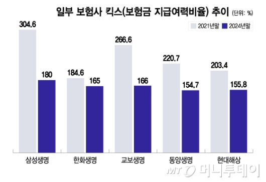 실제 주요 보험사들의 자본비율은 3년 만에 '반토막'이 났다. 삼성생명은 2021년 304.5%에서 지난해 말 180%로 급락했고, 교보생명도 같은 기간 266.6%에서 166%(경과조치 적용 후)로 100%포인트 넘게 떨어졌다. 한화생명은 지난해 말 165%로 하락, 가이드라인에 바짝 다가섰다. 동양생명(154.7%)과 현대해상(155.8%) 역시 당국의 권고 수준인 150%에 초근접했다.