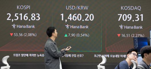 11일 오전 서울 중구 하나은행 본점 딜링룸 전광판에 코스피 지수가 전 거래일 대비 53.56p(2.08%) 하락한 2,516.83을 나타내고 있다. 한편 간밤의 뉴욕증시는 트럼프의 관세 폭탄 남발로 미국 경제가 스태그플레이션에 빠질 가능성이 고조되며 다우존수지수가 2.08%, S&P500은 2.69%, 나스닥이 4.00% 각각 급락했다. 뉴스1 |