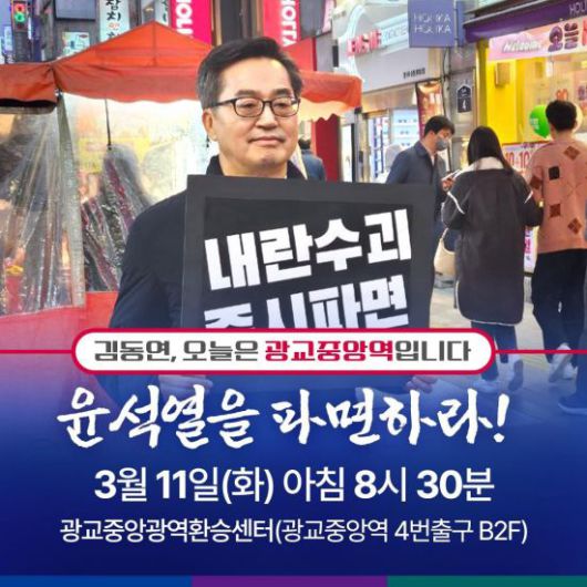 김동연 지사는 11일 오전 8시30분 수원 광교 중앙역에서 1인 피켓시위를 마친 뒤 기자들과 만나 "지금 내란수괴가 구치소에서 개선장군처럼 걸어 나왔다"며 "지금 이같은 상황 속에서 경기도지사로서 마음 같아서는 천막농성이든 단식농성이든 하고 싶지만 지사로서 현직이 있기 때문에 제가 할 수 있는 가장 효과적인 방법이 근무시간 전이나 근무시간 후에 1인시위를 통해서 우리 도민들과 국민들께 내란수괴 나온 것에 대한 잘못된 것, 그리고 조속한 탄핵을 주장하기 위해서 나왔다"고 이날 시위 배경을 설명했다.