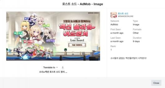 한편, 센서타워의 광고 데이터에 따르면, 《로스트 소드》는 전체 광고 노출 중 약 79%를 AdMob을 통해 확보하며 1월 기준 모바일 서브컬처 게임 광고 점유율 2위, 2월에는 1위를 기록한 것으로 나타났다. 센서타워는 《로스트 소드》의 광고 소재가 이미지 기반의 2D 비주얼 스타일을 강조하면서도, ‘액션 플러팅 어드벤처’라는 광고 카피를 활용해 방치형 게임 속에서도 액션과 서브컬처적 요소를 강조한 점이 효과적이었다고 평가했다.