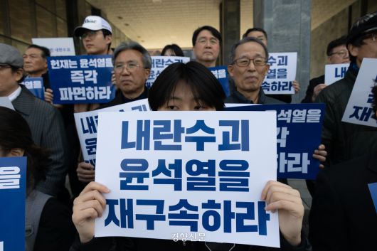 이들은 “윤 대통령 탄핵이 헌재에서 인용될 때까지 연대로 싸우겠다”며 신속한 파면을 촉구했다. 서울대 동양사학과 대학원생 김찬호씨는 “윤석열의 석방으로 내란이 아직 멈추지 않았다는 것을 알게 됐다”며 “지난해 12월3일 국회로 향하던 우리의 마음도 멈추지 않을 것”이라고 말했다. 박배균 사범대 지리교육과 교수는 “윤 대통령의 구속은 12·3 비상계엄 사태라는 초유의 헌정 질서 유린 사태에 민주 시민들이 투쟁한 끝에 얻어낸 결과였다”며 “윤 대통령과 극우 세력의 망상적 신념과 내란을 멈추려면 헌재는 신속히 파면 결정을 내려야 한다”고 말했다.