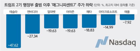 문제는 이미 미 경제의 침체 신호가 트럼프 대통령 취임 이후 지속적으로 나왔다는 점이다. 지난해 역대급 활황세를 이어갔던 미 증시는 기세가 확연하게 꺾였다. 트럼프 대통령 취임식 다음날인 1월21일 1만9756.78을 기록했던 나스닥지수는 1만7468.32로 11.58% 하락했고, 같은 기간 스탠더드앤드푸어스(S&P)500 지수는 6049.24에서 5614.56으로 7.1% 내렸다. 특히 지난해 미 증시 상승세를 견인했던 7개 거대정보기술(빅테크) 기업들인 ‘매그니피센트 7’은 이날 하루 만에 시가총액이 7740억달러(약 1129조원)나 사라지는 등 하향세가 두드러졌다. 테슬라는 트럼프 행정부 취임 이후 주가가 무려 47.62%가 주저앉았고, 엔비디아도 취임식 이후 가장 주가가 높았던 1월23일 대비 27.34% 주가가 빠진 상황이다. 마이크로소프트와 아마존, 메타, 알파벳도 모두 해당 기간 최고가 대비 주가가 10% 이상 하락했다.