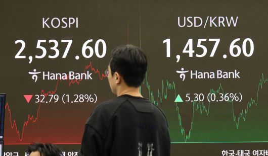 코스피도 ‘휘청’ 미국발 경기 침체 우려로 증시가 급락한 11일 서울 중구 하나은행 딜링룸 현황판에 코스피 지수와 원·달러 환율이 표시되고 있다. 이날 코스피는 전 거래일 대비 32.79포인트(1.28%) 내린 2537.6에 거래를 마감했다. 원·달러 환율은 전일 대비 5.9원 오른 1458.2원에 주간 거래를 마쳤다. 이제원 선임기자 |