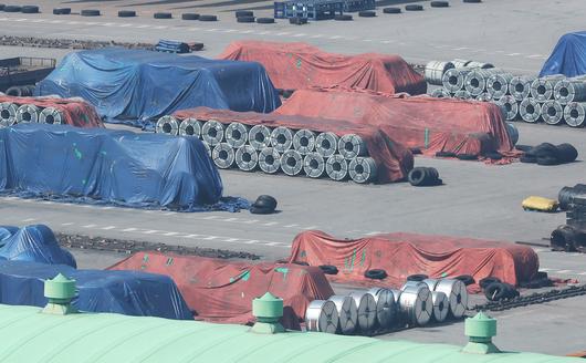 미국 도널드 트럼프 행정부가 모든 수입산 철강·알루미늄 제품에 25% 관세를 부과하겠다고 예고한 3월 12일을 하루 앞둔 11일 경기도 평택항에 철강 제품이 쌓여 있다. [연합] |