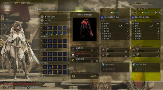 그 중 몬스터를 때려 잡고 소재를 뜯어 만드는 일반적인 장비와 다르게 소지품 교환으로 얻는 '불길한 천'이 주 재료인 데스기어 세트가 덧입기 장비로 인기가 있다. 높은 노출도와 특정 부위의 볼륨을 강조하는 디자인이 매력적인 세트다.