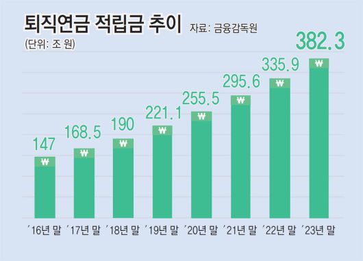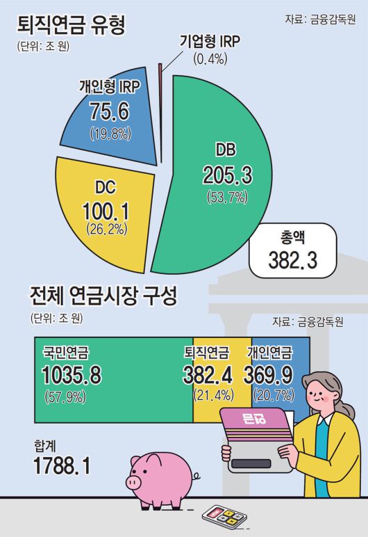 금융감독원에 따르면 2023년 말 기준 퇴직연금 적립금 규모는 382조4000억 원. 업계에서는 2024년 420조 원 규모로 불어났을 것으로 추산한다. 국민연금과 개인연금을 합친 전체 연금시장에서 퇴직연금의 비중은 21.4%까지 성장했다. 하지만 내용을 들여다보면 미진한 점이 많다.