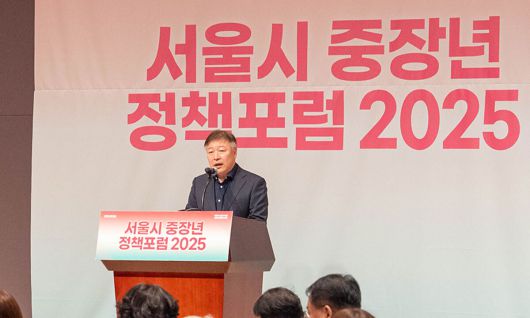 강명 서울시50플러스재단 대표이사가 11일 서울 중구 한국프레스센터에서 열린 ‘서울시 중장년 정책 포럼 2025’ 연단에 올라 개회사를 하고 있다. 서울시50플러스재단 제공 |