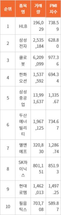HLB는 196,029주의 거래량을 기록하고 있으며, PMI 지수는 738.59포인트로 나타났다. 삼성전자는 2,535,184주의 거래량과 628.80포인트의 PMI 지수를 보이고 있다. 클로봇은 6,209,099주가 거래되며 PMI 지수는 977.36포인트를 기록했다. 한화오션은 1,537,592주의 거래량에 PMI 지수는 694.34포인트를 보인다. 삼성중공업은 13,991,637주의 거래량과 1,335.67포인트의 PMI 지수를 기록하고 있다.