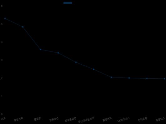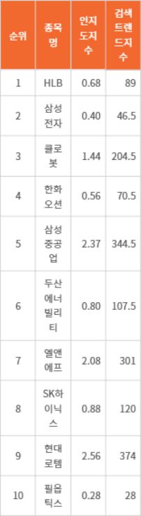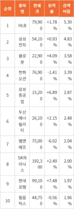 두산에너빌리티(034020)의 검색비율은 2.48%로 나타났으며, 엘앤에프(066970)는 2.04%, SK하이닉스(000660)는 2.00%, 현대로템(064350)은 1.97%, 필옵틱스(161580)는 1.96%의 검색비율을 기록하고 있다.