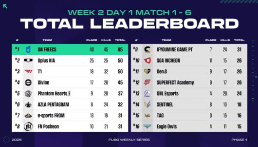 한편 PWS: 페이즈1 2주 1일차 경기에서는 DN 프릭스 외에도 2위 디플러스 기아 3위 T1 4위 디바인 5위 팬텀 하츠 6위 아즈라 펜타그램 7위 e스포츠 프롬 8위 FN 포천 등이 맹활약을 펼쳤다.