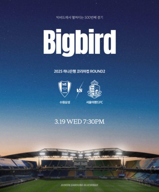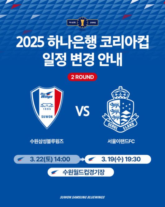수원 삼성은 12일 공식 SNS를 통해 2025 하나은행 코리아컵 2라운드 일정을 알렸다. 3월 19일 수요일 오후 7시 30분 수원월드컵경기장에서 서울 이랜드를 상대한다.