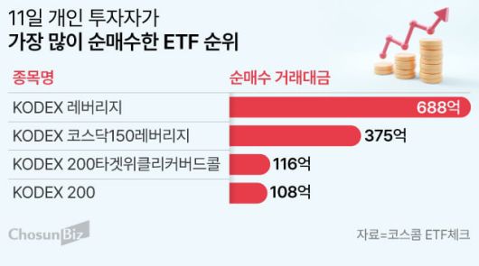 코스콤 ETF체크에 따르면 11일 기준 개인 투자자가 가장 많이 순매수한 종목은 ‘KODEX 레버리지’였다. 이 ETF는 코스피200 지수가 오를 때 일별 등락률을 2배 추종한다. 개인 투자자는 이날 하루 KODEX레버리지를 689억원어치 순매수했다.