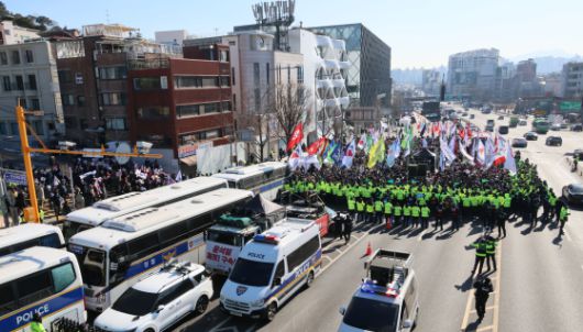지난 1월 4일 서울 용산구 한남동 대통령 관저 인근에서 집회를 벌이던 민주노총 등 진보단체 회원들이 관저 방향으로 행진하려다 경찰에 가로막혀 있는 모습. 〈사진=연합뉴스〉 |