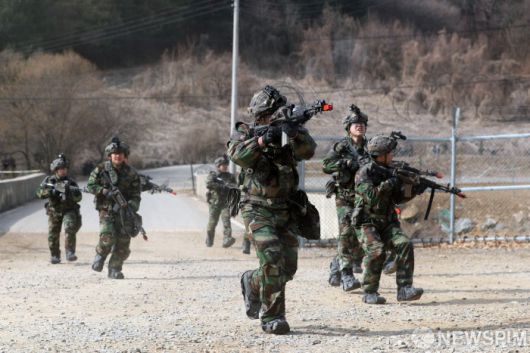 [파주=뉴스핌] 사진공동취재단 = 12일 경기 파주시 무건리 훈련장에서 2025 FS/TIGER 일환으로 실시된 유무인 복합전투체계 활용 '한미연합 WMD(대량살상무기) 제거훈련'에서 25사단 장병들이 장애물을 개척하며 전진하고 있다. 2025.03.12 photo@newspim.com