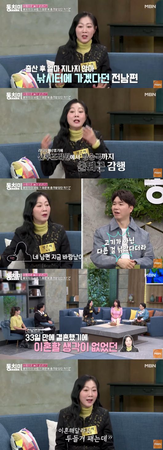 방은희는 "(첫 번째 전 남편이) 제가 아이 낳은지 얼마 안 됐는데 갑자기 낚시터에 가겠다고 하더라. 그래서 그러라고 했다. 근데 거기 뒤풀이에서 여자를 만났나보다"라고 운을 뗐다.