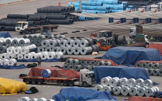 12일 오후 경기 평택시 포승읍 평택항 수출 야적장에 철강 제품이 쌓여 있는 모습. 뉴스1 |
